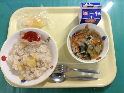 ポテトピラフ、鶏肉のチリソースがけ、ABCスープ、冷凍パイン、牛乳
