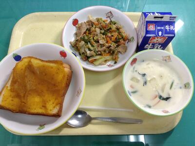 宇宙かぼちゃトースト、焼肉サラダ、米粉のクリームシチュー、牛乳