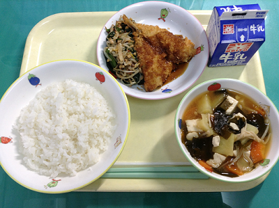 ごはん、アジフライ、納豆和え、味噌汁、牛乳