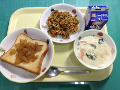 アップルシナモントースト、焼肉サラダ、米粉のクリームシチュー、牛乳