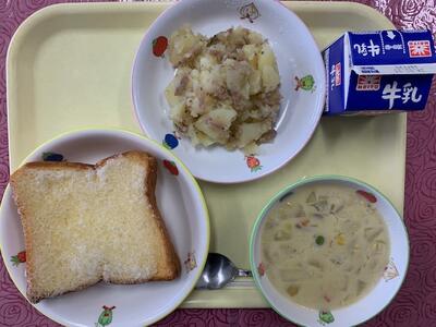 (献立): シュガートースト、牛乳、ジャーマンポテト、米粉のコーンシチュー