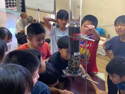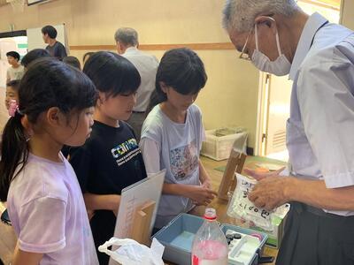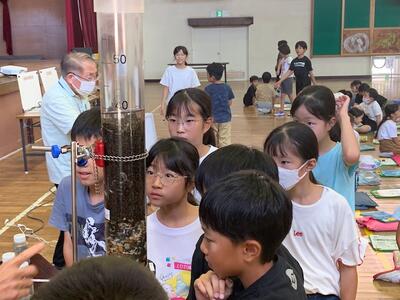 まず、紙芝居で浄水場の仕組みについて説明をしていただいた後、川の水が実際にきれいになる様子を実験で見せてもらいました。