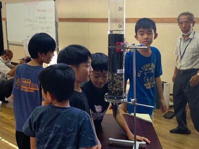 水の濁りを固める作業、ろ過の様子。特に、オゾンを使って脱色する実験には、子どもたちはとても驚いていました。