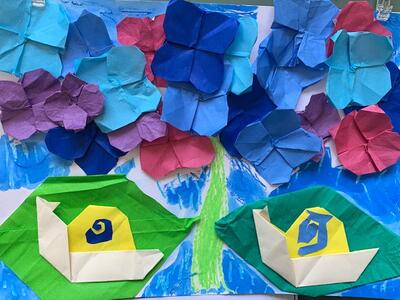 折り紙で「あじさい」の小さな花を1つ1つ折って、画用紙に貼っていきます。