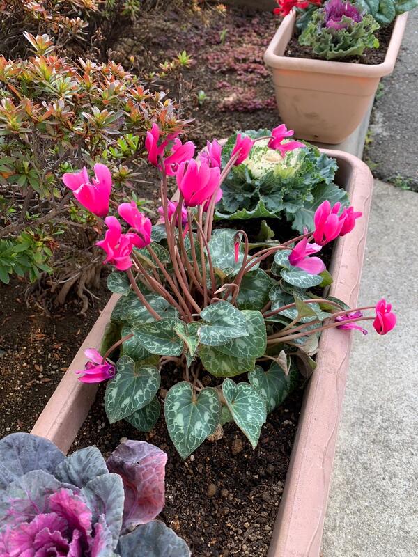 大洲小・宮田小から合わせて8組の親子が参加し、ガーデニングシクラメンと葉牡丹の寄せ植えを行いました。