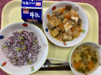 献 立 : ごはん、あじの南蛮漬け、野菜の磯煮、すまし汁、牛乳