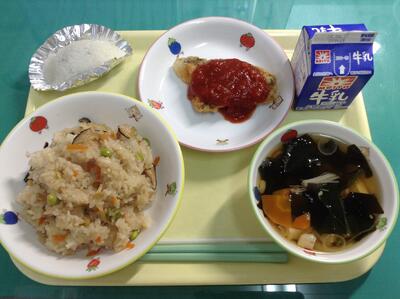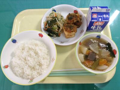 ごはん、里芋メンチ、ごぼうとハスの和風和え、せんべい汁、牛乳