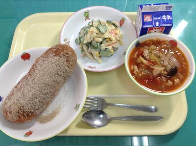 キャラメル揚げパン、チキンのトマト煮込み、マカロニサラダ、牛乳