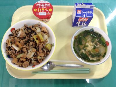 焼き鳥丼、にら玉スープ、ヨーグルト、牛乳