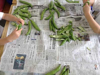 ↑ 今日の空豆は千葉県館山市産の空豆で、千葉県産は今が旬です。今日は1年生がサヤをむいてくれました。