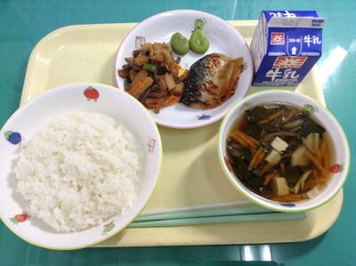 ごはん、サバの生姜焼き、切り干し大根の煮物、沢煮椀、茹で空豆、牛乳