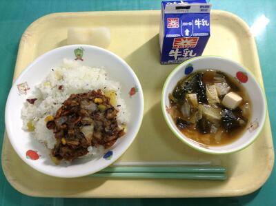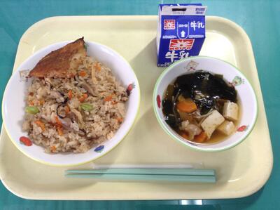 わかめしらすごはん、松風焼き、すき焼き風煮、市川の梨(新高)、牛乳