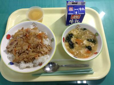 焼き鳥丼、沢煮椀、ぶどうゼリー、牛乳