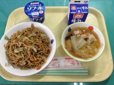ナポリタン、洋風煮込み、がまくんクッキー、牛乳
