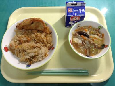 キャロットピラフ、ローストチキン、ABCスープ、牛乳