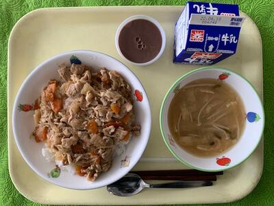 献 立 : ぶた丼、みそ汁、豆乳ココアプリン、牛乳