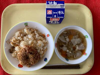 献 立 : たけのこごはん、さばの西京焼き、とり団子汁、牛乳