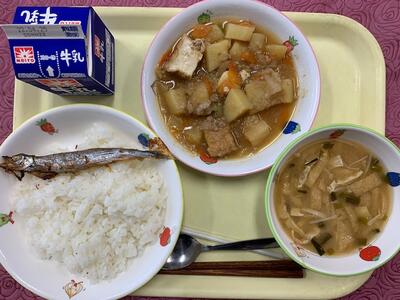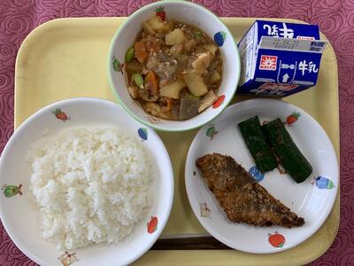 献 立 : ごはん、いわしの更紗揚げ、生揚げの炒め物、わかめスープ、牛乳