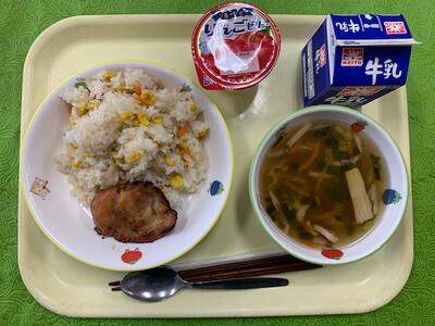 献 立 : コーンライス、とり肉のママレード焼き、春雨スープ、りんごゼリー、牛乳