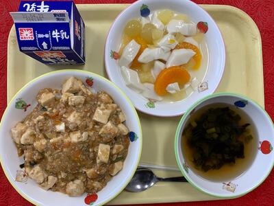 献 立 : マーボー丼、中華スープ、杏仁フルーツ、牛乳