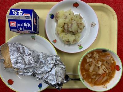 献 立 : きな粉揚げパン、ジャーマンポテト、ミネストローネスープ、牛乳
