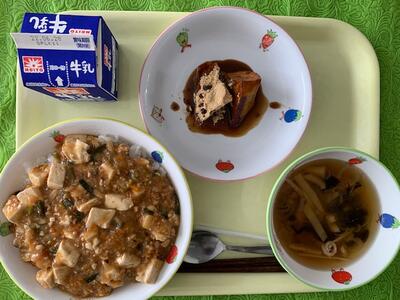 献 立 : マーボー丼、中華スープ、さつま芋の黒みつがけ、牛乳