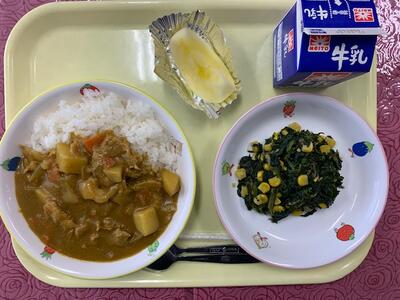 (献立): カレーライス、ほうれん草のソテー、りんご、牛乳