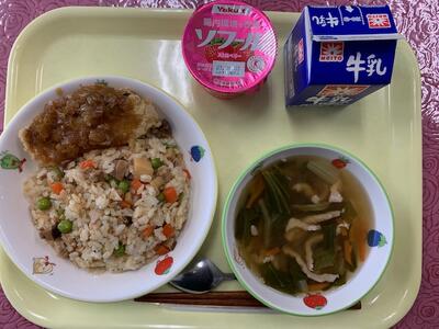 (献立): 中華風おこわ、あじの南蛮漬け、チンゲン菜のスープ、ヨーグルト、牛乳