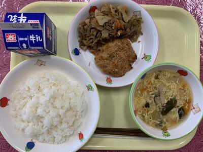 (献立): ごはん、松風焼、五目金平、かきたま汁、牛乳