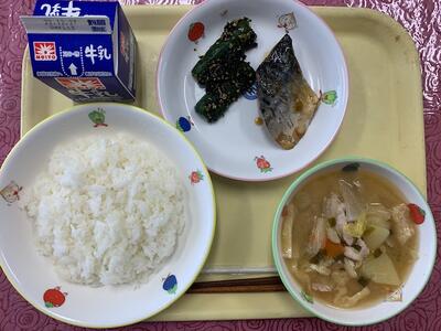 (献立): ごはん、鯖の甘露煮、胡瓜の磯和え、みそ汁、牛乳