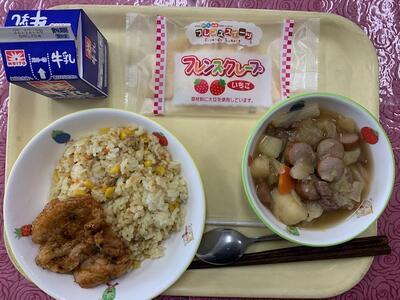 (献立): メキシカンライス、鶏肉のレモン煮、ポトフ、いちごクレープ、牛乳