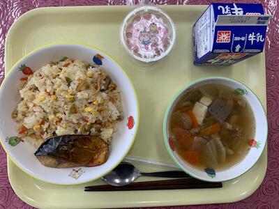 (献立): ドライカレー、野菜スープ、さつま芋チップス、牛乳