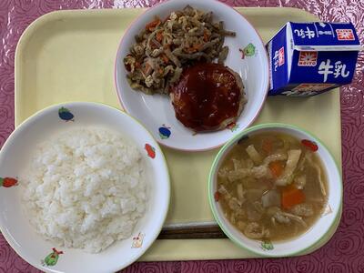 (献立): ごはん、豆豆ハンバーグ、切り干し大根の煮物、みそ汁、牛乳