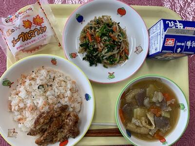 (献立): 鮭ごはん、とり肉の唐揚げ、胡麻和え、さつま汁、お米deメープルマフィン、牛乳