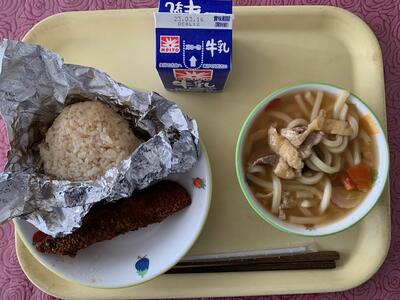 (献立): 茶飯のおにぎり、煮込みうどん、鮭フライ、牛乳