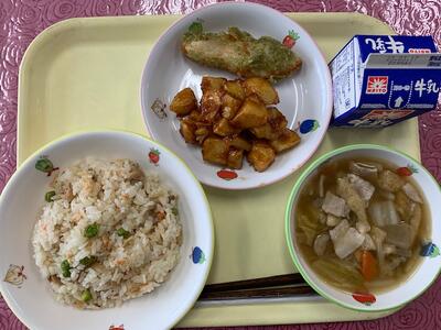 (献立): かやくごはん、みそかんぷら、笹かまぼこの磯辺揚げ、ちゃんこ汁、牛乳