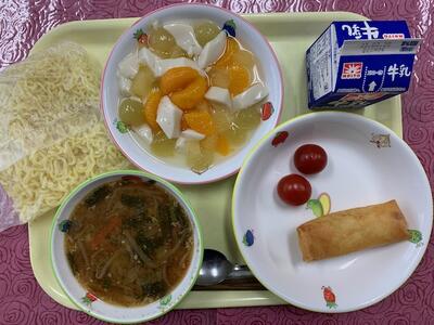 (献立): みそラーメン、ポテト春巻き、ミニトマト、杏仁フルーツ、牛乳