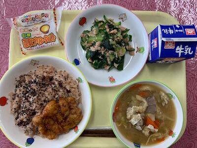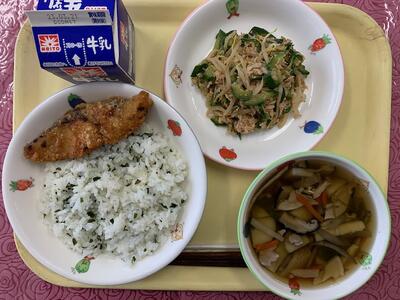 (献立): わかめごはん、たらの香味揚げ、胡麻酢和え、沢煮椀、牛乳