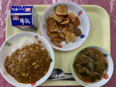 (献立): ドライカレー、野菜スープ、さつま芋チップス、牛乳