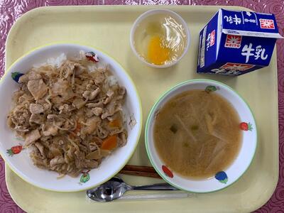 (献立): 豚丼、牛乳、味噌汁、フルーツゼリー
