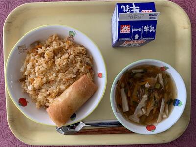(献立): キムたくごはん、牛乳、ポテト春巻、春雨スープ