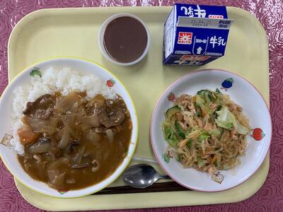 (献立): チキンカレーライス、牛乳、コーンのサラダ、美生柑