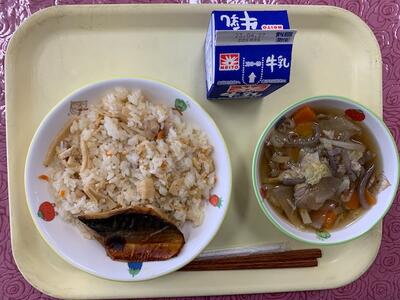 (献立): たけのこ御飯、牛乳、鯖の西京焼き、ちゃんこ汁