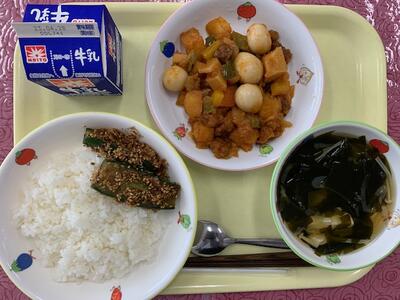 (献立): ごはん、牛乳、酢豚、胡瓜のおかか和え、わかめスープ