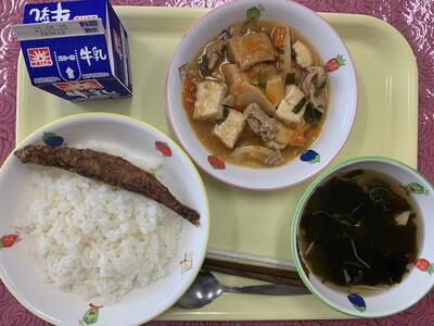 (献立): ごはん、牛乳、ししゃものカレー揚げ、生揚げの炒め物、わかめスープ