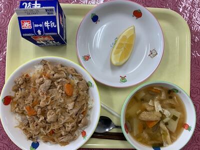 (献立): 豚婆丼、牛乳、味噌汁、果物(小夏)
