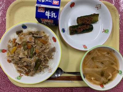 (献立): プルコギ丼、牛乳、胡瓜の梅肉和え、味噌汁