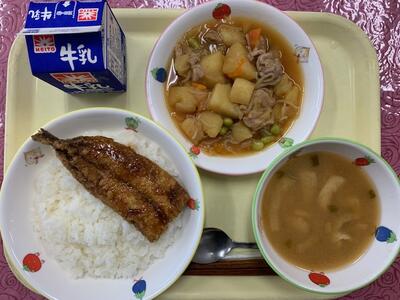 (献立): ごはん、牛乳、いわしの蒲焼き、肉じゃが、味噌汁