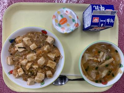 (献立): 麻婆丼、牛乳、ワンタンスープ、フローズンオレンジゼリー