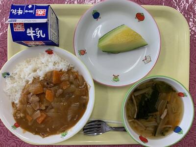(献立): カレーライス、牛乳、野菜とわかめの和え物、果物(小夏)